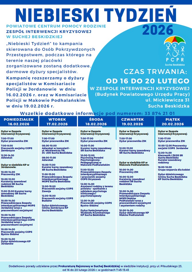 "NIEBIESKI TYDZIEŃ" dla mieszkańców Powiatu Suskiego Powrót Drukuj Powiatowe Centrum Pomocy Rodzinie ZESPÓŁ INTERWENCJI KRYZYSOWEJ w Suchej Beskidzkiej zaprasza mieszkańców Powiatu Suskiego na "Niebieski Tydzień". Pliki do pobrania 127.32 KB